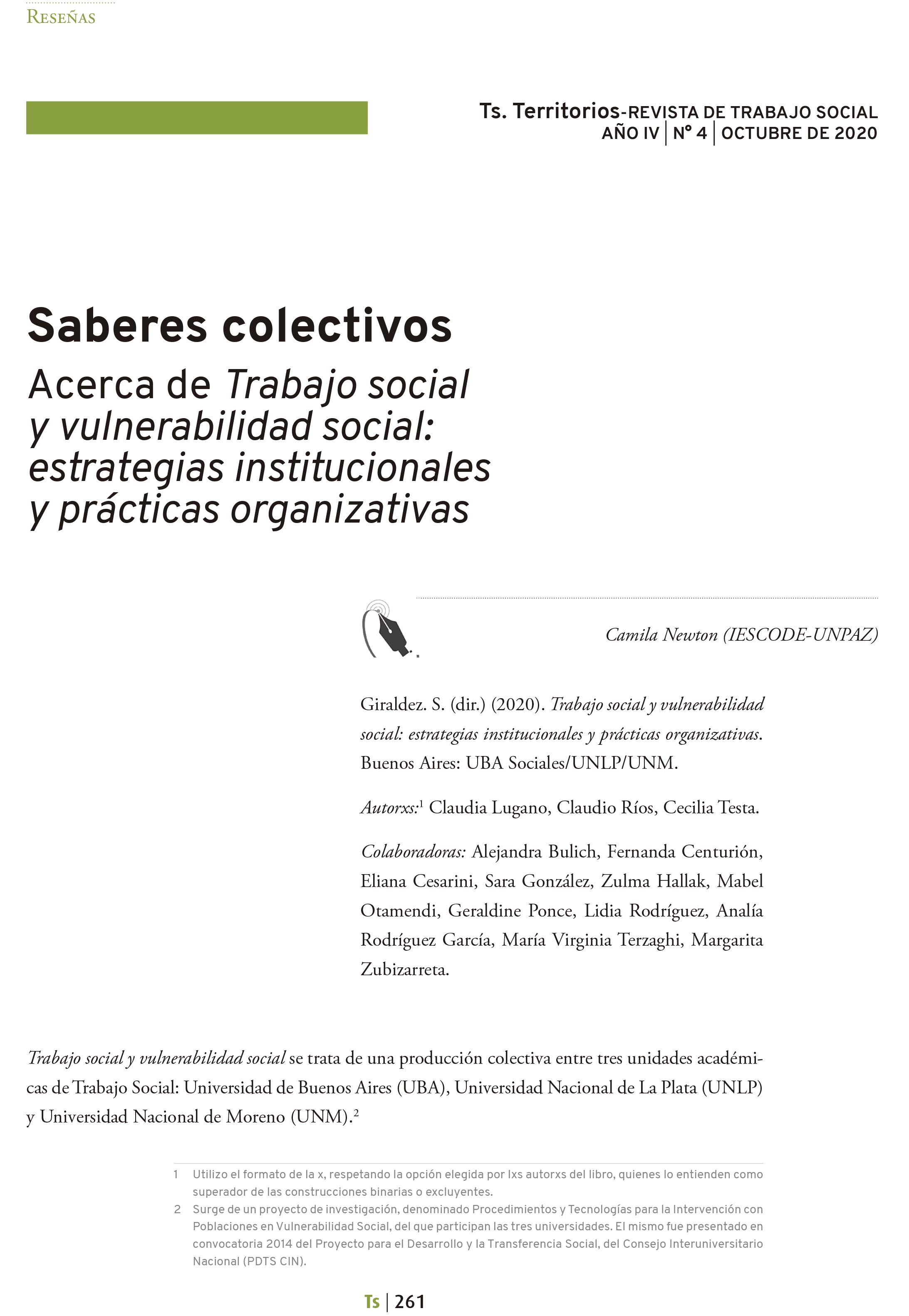 Saberes Colectivos. Acerca de Trabajo Social y vulnerabilidad social: estrategias institucionales y políticas organizativas. Autor: Camila Newton